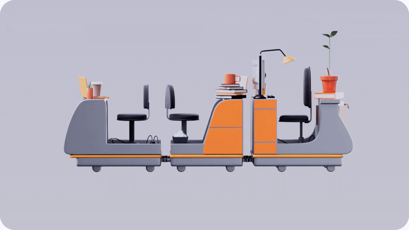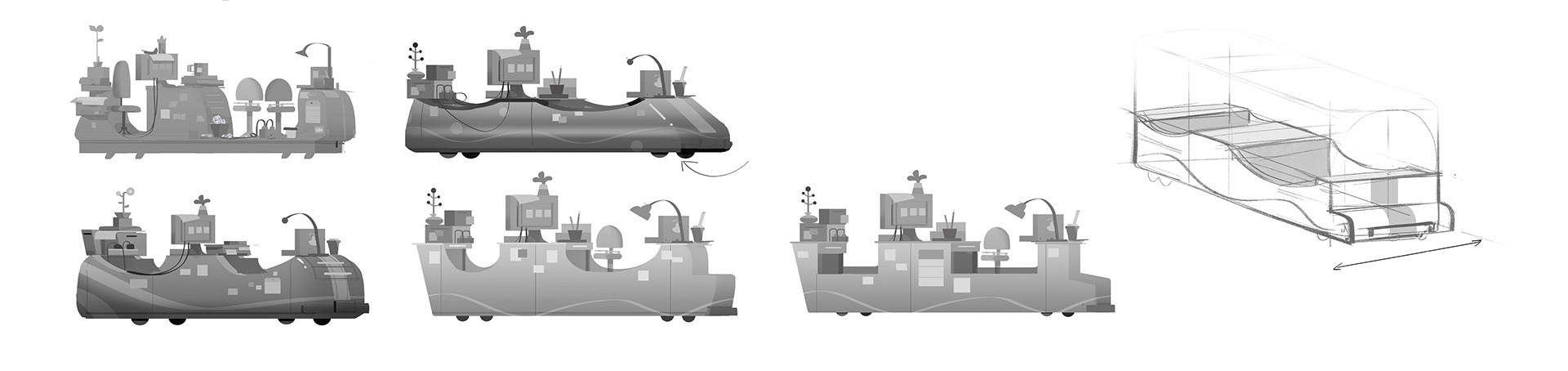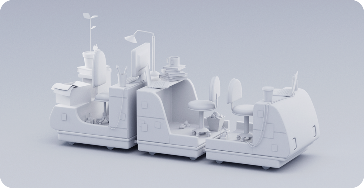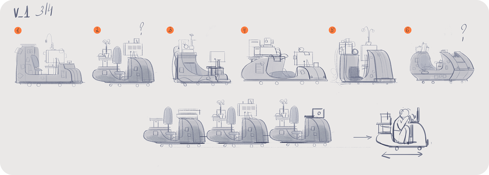 The design process began with a series of silhouette explorations to establish the overall shape and function of the minecart. Various compositions were tested, combining everyday office elements with a mobile platform concept. The final 3D model brings together three modular workspaces, each equipped with furniture and accessories, forming a playful and imaginative moving workstation.