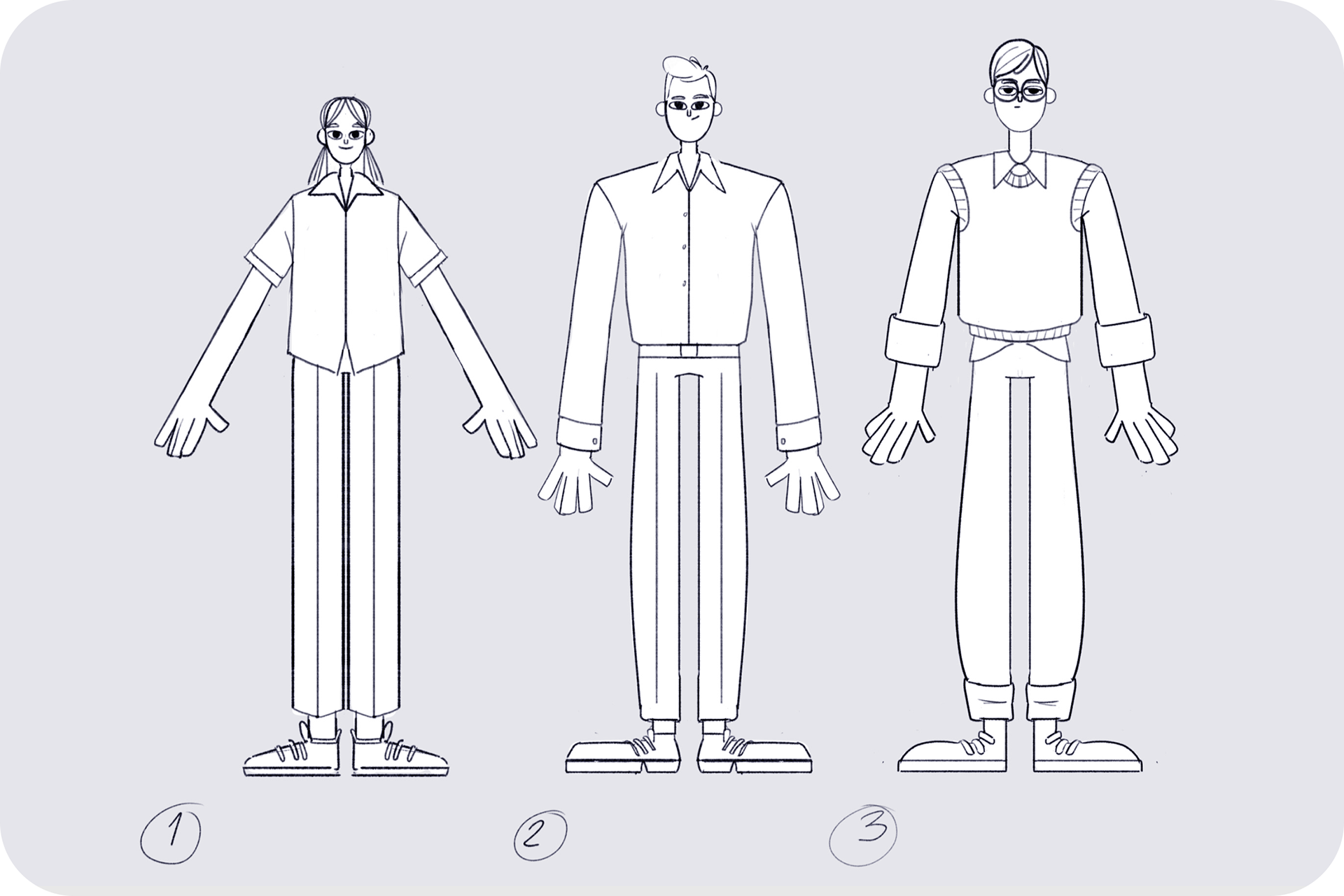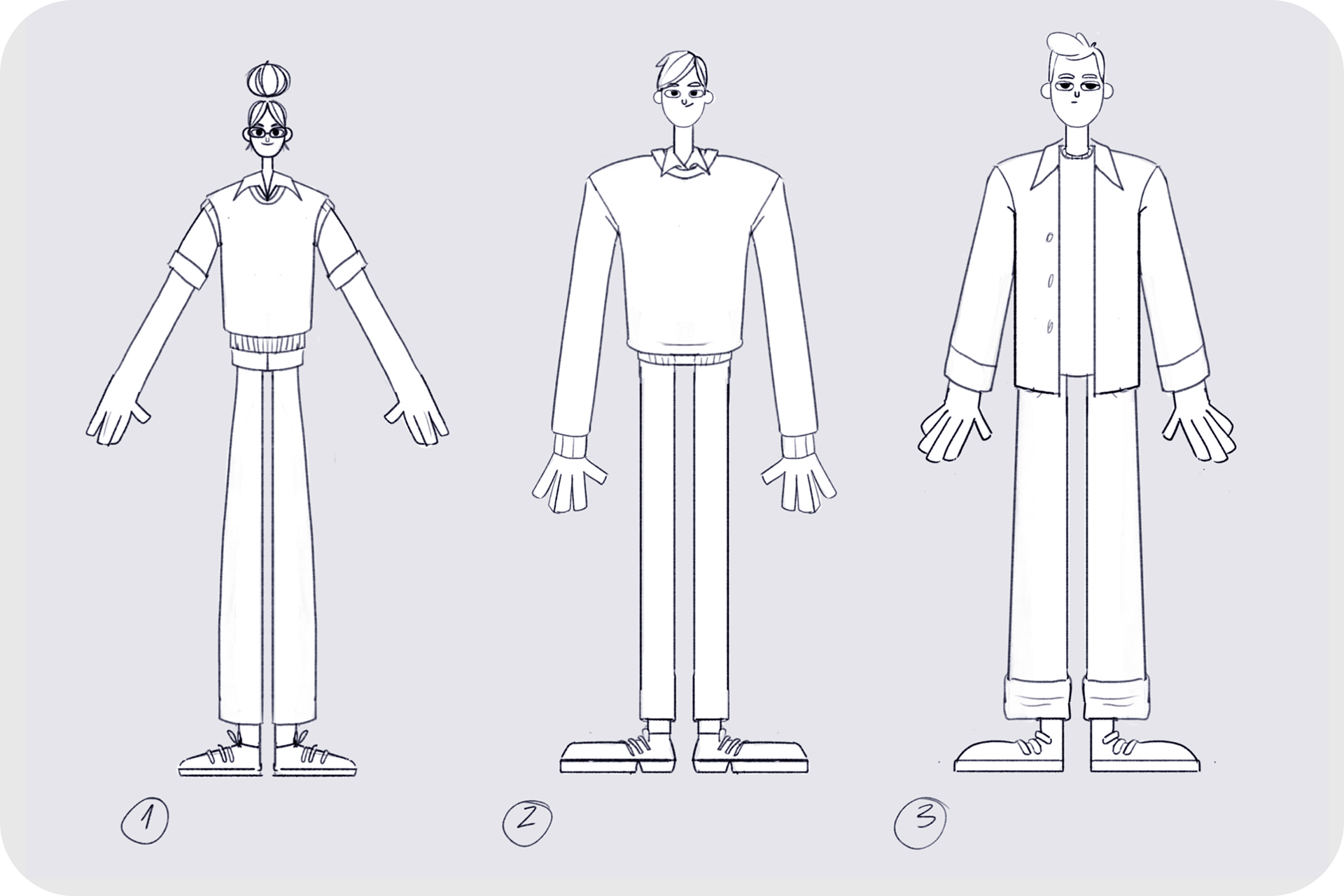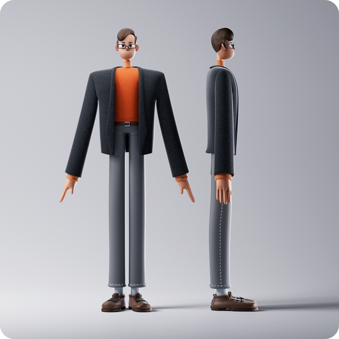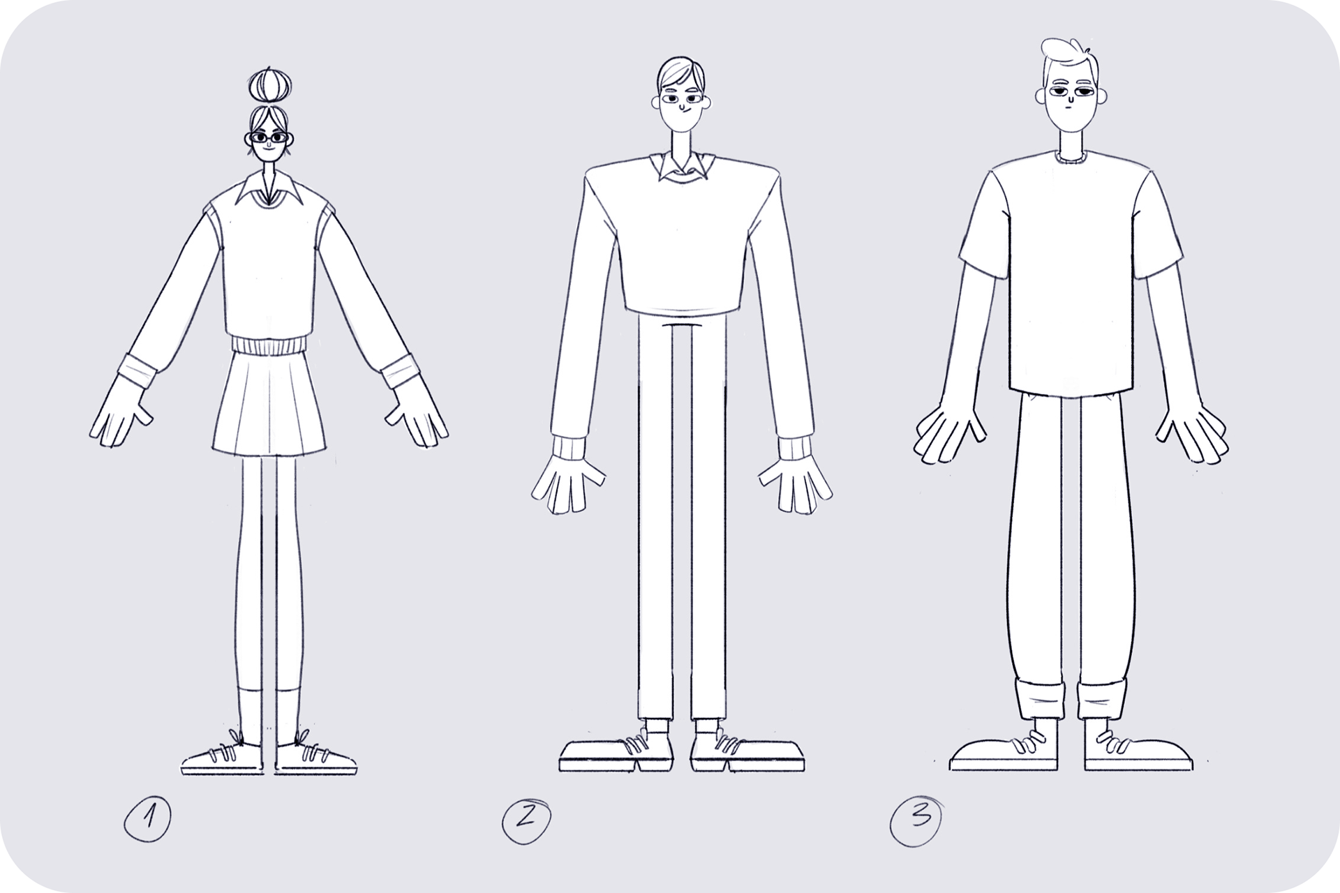 The characters were first developed in 2D to explore proportions, silhouettes, and style. Multiple variations were sketched and refined to find the right balance between simplicity, readability, and personality. Each design focused on clear posture and visual distinction, laying a solid foundation for the final 3D models.