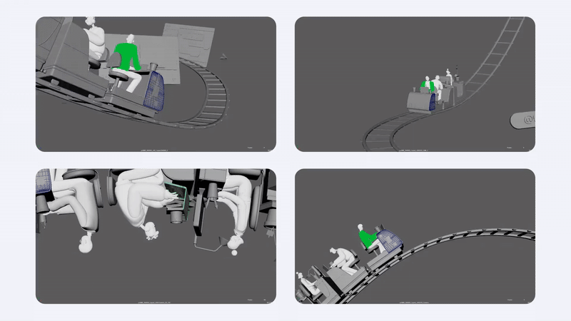 We created custom character models and built individual rigs for each of them. The minecart itself was also rigged and animated to follow a procedurally generated track path. The animation was a collaborative effort between Maya and Cinema 4D, combining the strengths of both tools to achieve a dynamic and fluid result.