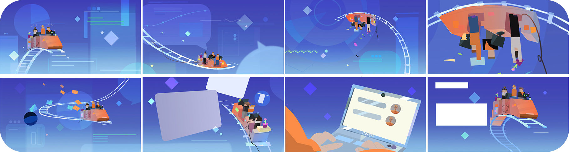 Designed for B2B clients, this project builds trust by showing how Yandex 360 effectively tackles real industry challenges. With a clear business allegory — carts overcoming obstacles, the story illustrates how companies move forward more smoothly with the right solutions. A custom animation system creates rails in mid-air, symbolizing building one’s own path. Universal office-style characters add relatability, while Yandex 360 interface elements reinforce the message of simplifying and improving daily workflows.