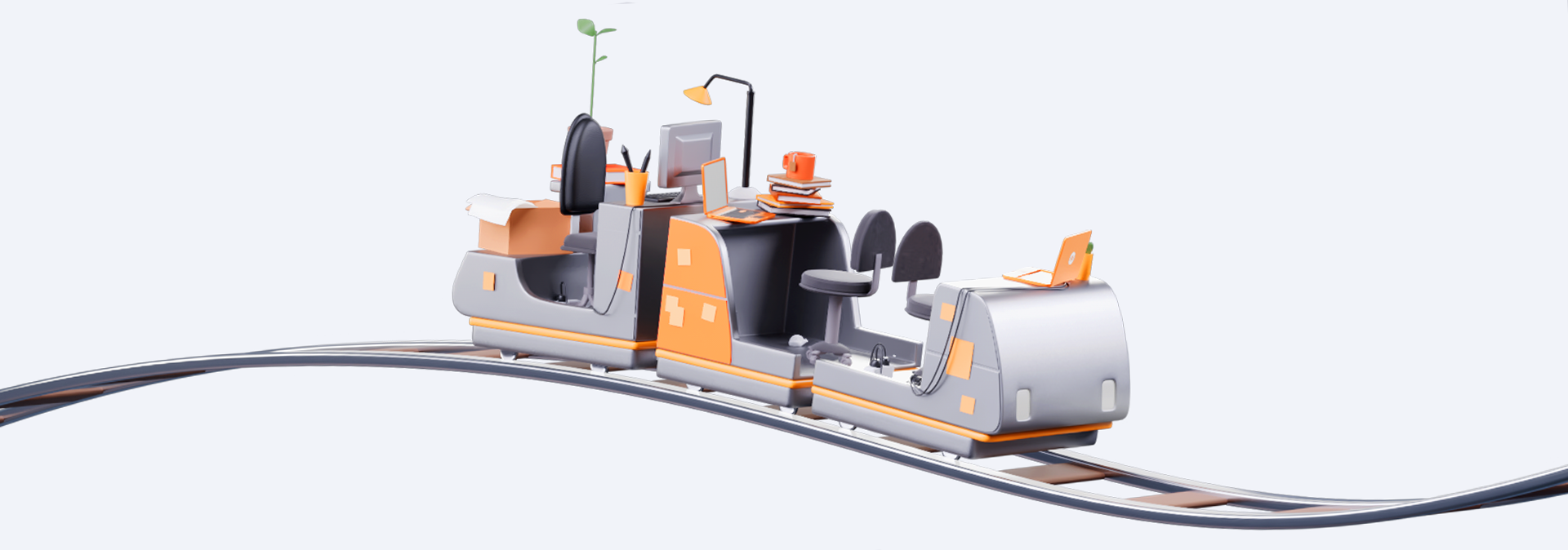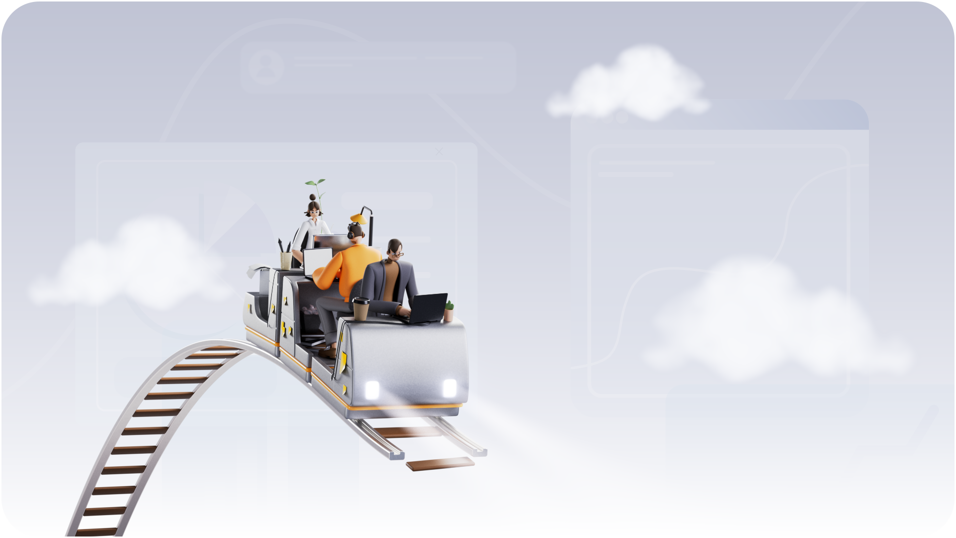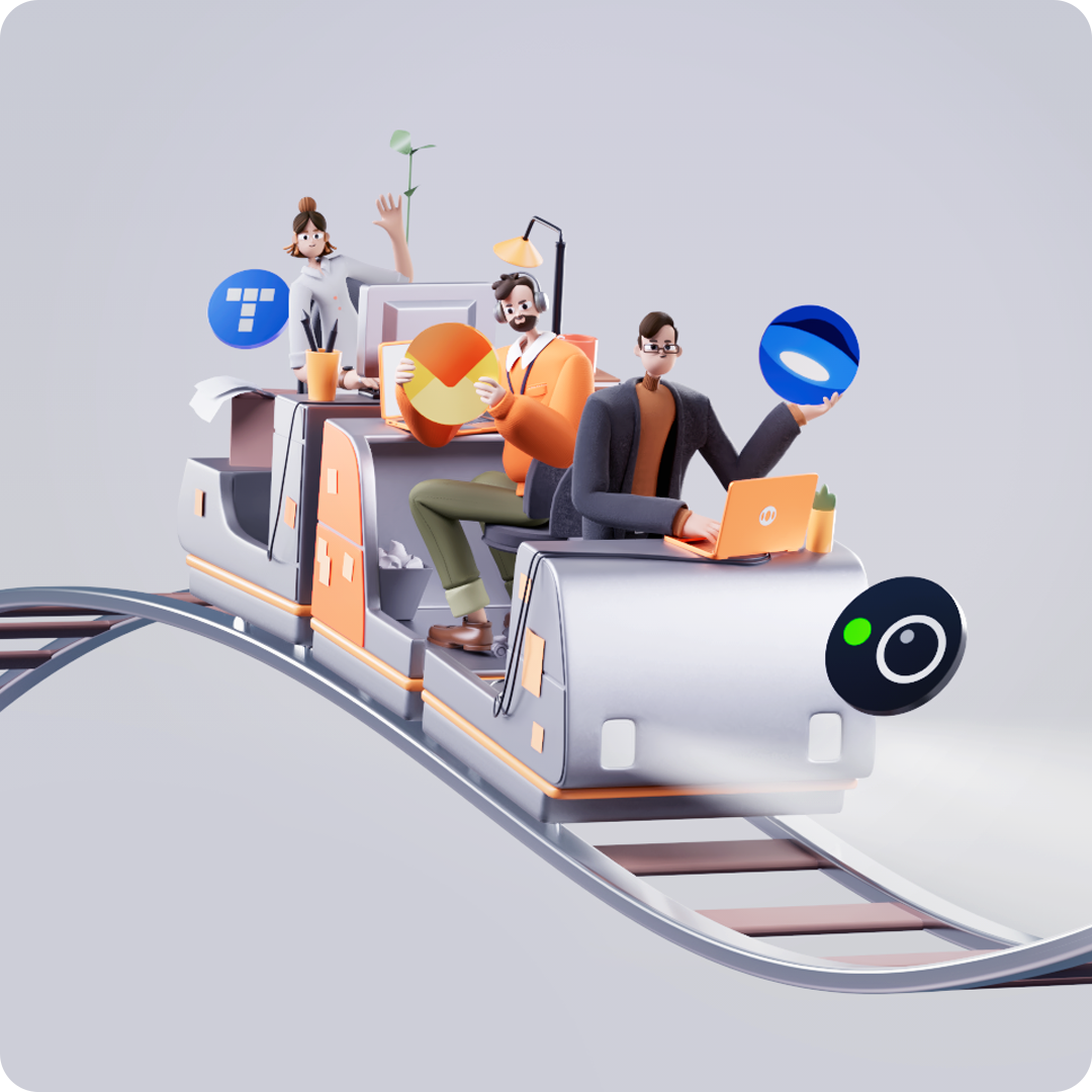 Each character is stylized with clean shapes, exaggerated proportions, and soft detailing, making them instantly readable and visually engaging. Additionally, four supporting characters appear in the second cart-office, adding depth to the narrative and symbolizing growth, collaboration, and the expanding capabilities of a modern team.